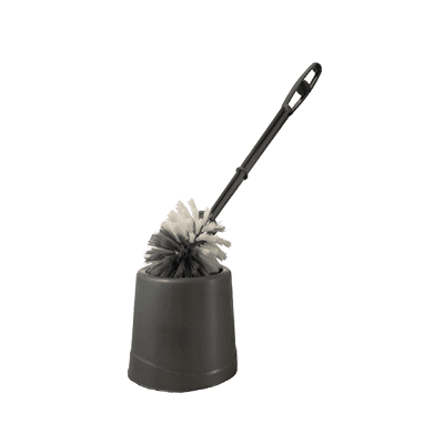 - Long-handled plastic brush, with a round head and hard, synthetic bristles.