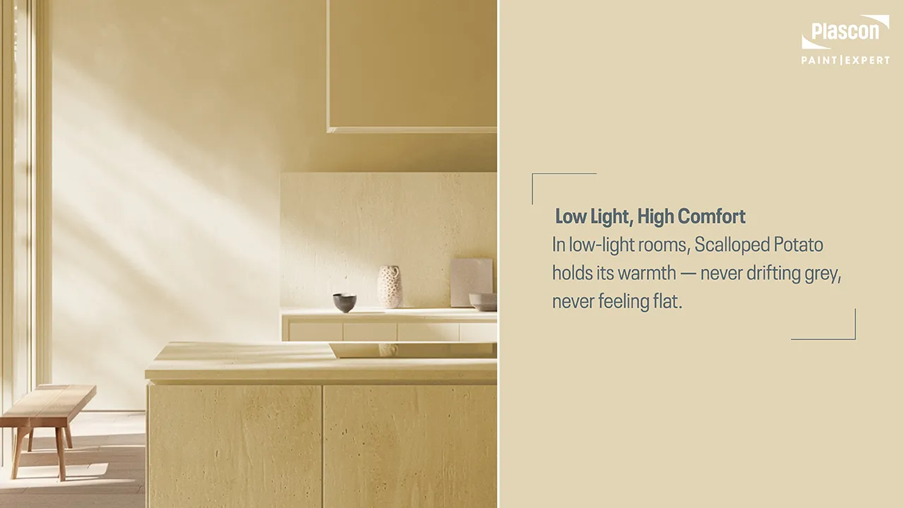 In low-light conditions, Scalloped Potato does something many neutrals can’t: it holds its warmth. Rather than shifting grey or muddy, it maintains a soft, buttery glow.